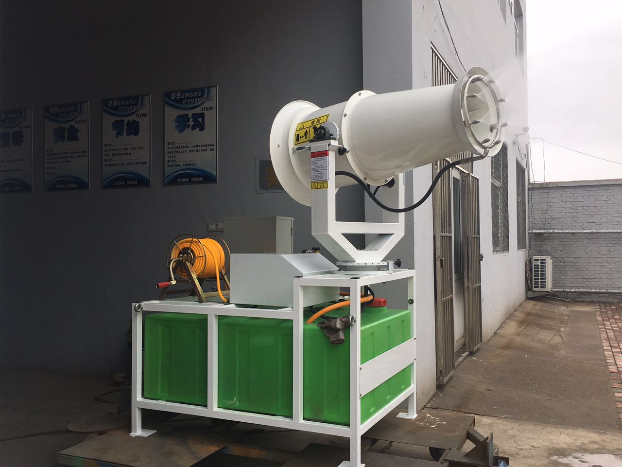 霧炮機的原理是灰塵可以通過(guò)與水結合而聚集和增加,使得細小的灰塵通過(guò)相等直徑的水滴的小胡作用,降低水面的張力,并使灰塵顆粒和水霧凝聚成一團,在重力額作用下,它落到了地面,當霧粒接近顆粒大小時(shí),減塵效果 ,噴霧器通過(guò)高壓泵對水加壓,一定壓力的高壓水通過(guò)高壓霧化噴嘴產(chǎn)生直徑接近塵粒的水霧,通過(guò)大功率風(fēng)扇將水霧送到除塵區域,制成水霧和霧氣,灰塵顆粒迅速附和凝結,在自身重力下沉降,達到降塵的目的,還具有加濕和冷卻功能。