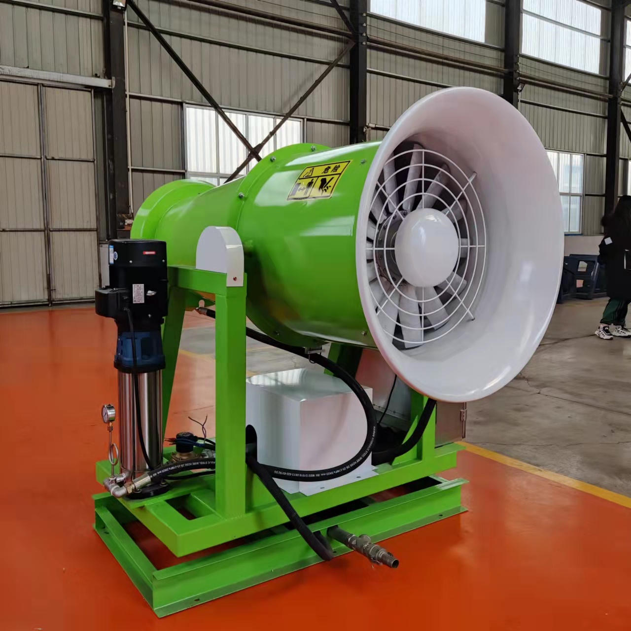 風(fēng)送式噴霧除塵機噴霧壓力是指噴霧系統進(jìn)行正常降塵作業(yè)時(shí),流體流徑高壓霧化噴嘴處的壓力值。隨著(zhù)水壓的不斷增大,霧滴直徑越小時(shí),粉塵與霧粒的接觸面積 會(huì )相應增加,降塵效率也越好。但是,壓力過(guò)高也造成耗電多、器件易損壞,降低降塵裝置使用壽命,同時(shí)壓力過(guò)高也對供水管路的維護帶來(lái)困難,極易引起管路破損導致無(wú)法正常降塵作業(yè)。因此,在滿(mǎn)足降塵效果較好的前提下,需要控制降塵霧炮噴霧壓力,避免井下水資源浪費和零部件損耗。
