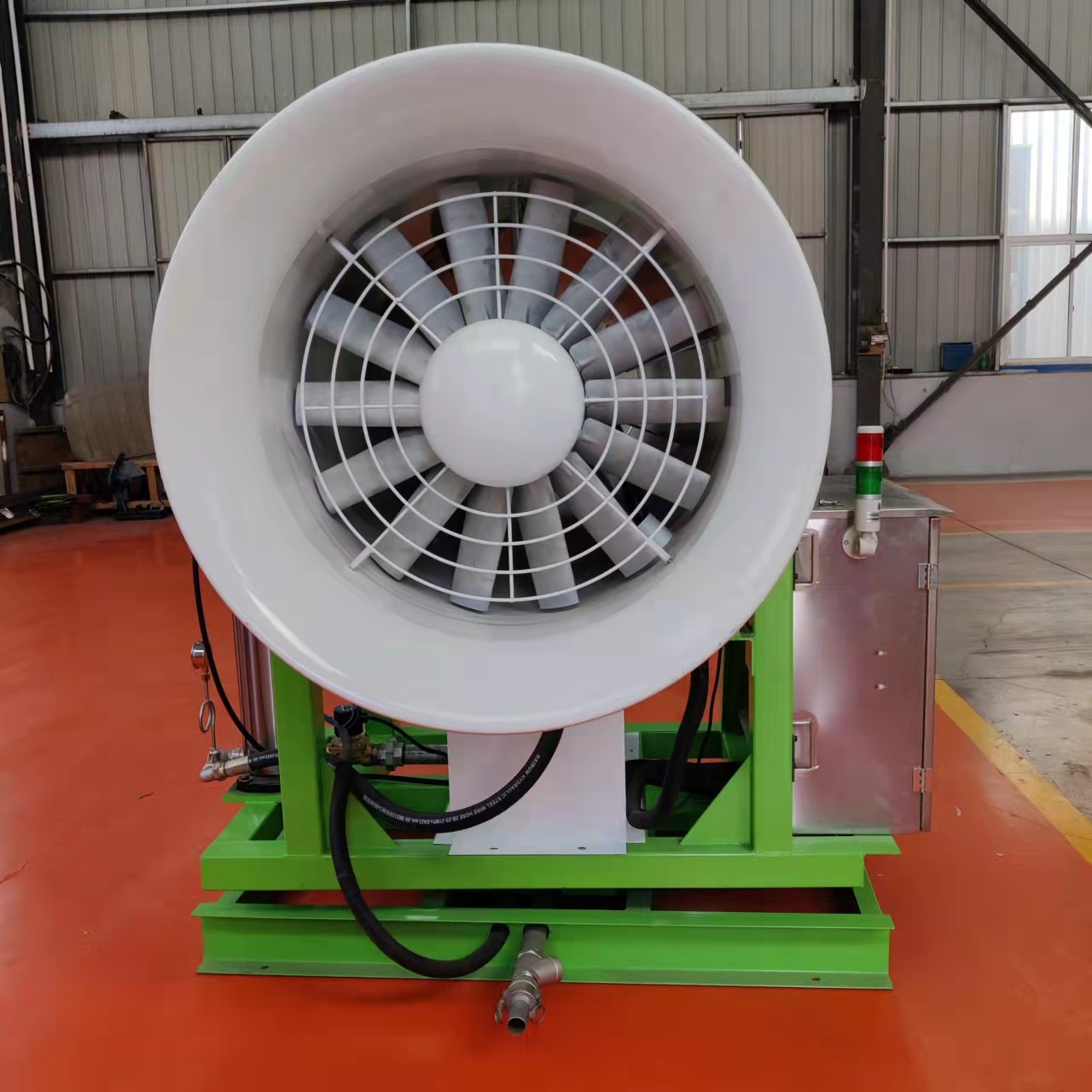 霧炮機屬于什么類(lèi)別,霧霾霧炮機是以旋轉式風(fēng)送低量噴霧為核心技術(shù)的新型高 效施藥機具。推車(chē)式除塵霧炮機主要由水泵、電機、風(fēng)機、大流道藥液輸送系統、轉盤(pán)式離心霧化器等主要零部件組成。通過(guò)潛水液泵輸出,經(jīng)大流道藥液輸送系統輸送至高旋轉的霧化轉盤(pán),在高速離心力的作用下,液體在霧化轉盤(pán)的邊緣被霧化成細小霧滴,霧滴由轉盤(pán)沿徑向拋出,并由風(fēng)機把霧滴吹送至前方。霧炮機進(jìn)行性能試驗研究,研究旋轉式離心除塵霧炮機 征、霧滴直徑、霧滴沉降分布規律、霧滴沉積密度均勻性、風(fēng)送低量噴霧效果等,掌握各參數相互匹配關(guān)系與工作原理,為進(jìn)一步 改行進(jìn)、產(chǎn)業(yè)化設計、關(guān)鍵部件精 確工藝研究等提供技術(shù)支撐。霧炮機是什么設備,在大氣污染嚴重的社會(huì ),霧炮機應運而生,有 效緩解漏料大氣污染的嚴重的現象。推進(jìn)了我國環(huán) 保事業(yè)的進(jìn)程。