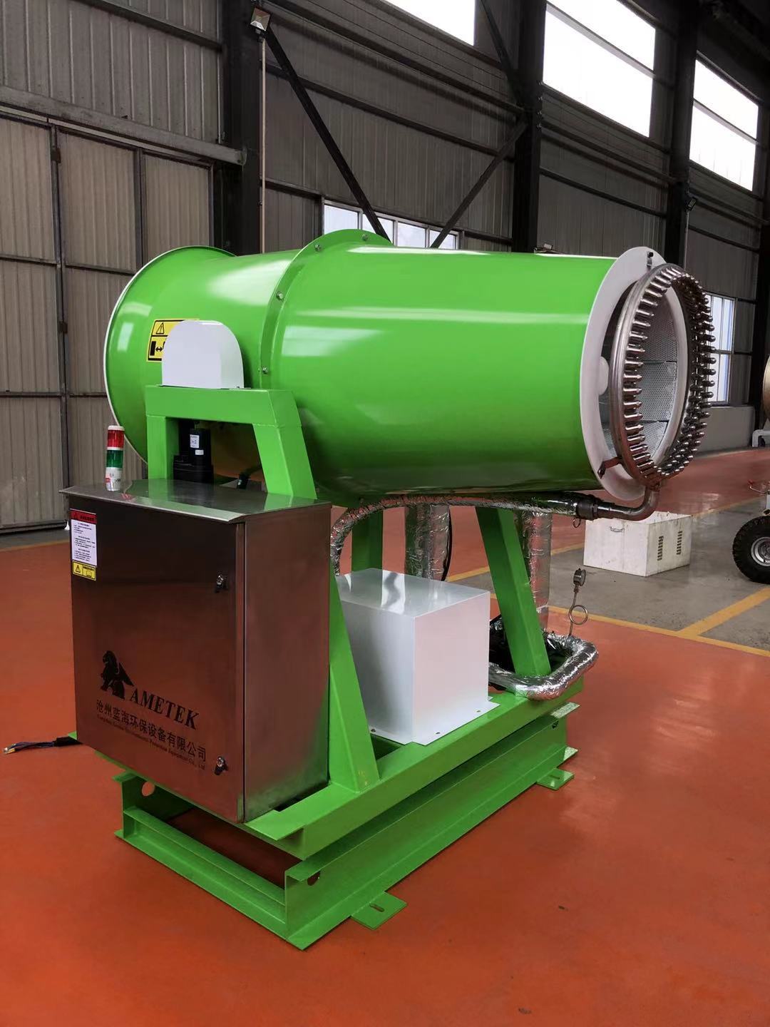 此款設備的噴霧距離是60米,配備的南方泵業(yè)的雙泵,壓力能達到4Mpa,噴射出來(lái)的霧粒30微米。風(fēng)機采用的是18.5KW的節能降噪風(fēng)機,整個(gè)設備啟動(dòng)起來(lái)噪音低于85db。這次的噴嘴要求也很?chē)栏?,達到了吹出來(lái)的霧落地不濕的效果。噴嘴嚴格那么過(guò)濾也得嚴格,水質(zhì)不好會(huì )堵塞噴嘴,整體設備單 配了一套過(guò)濾系統。還有自動(dòng)泄水功能,停機即自動(dòng)泄水。為了冬天 的使用,整體管路和水泵都做了嚴格的保溫設備。